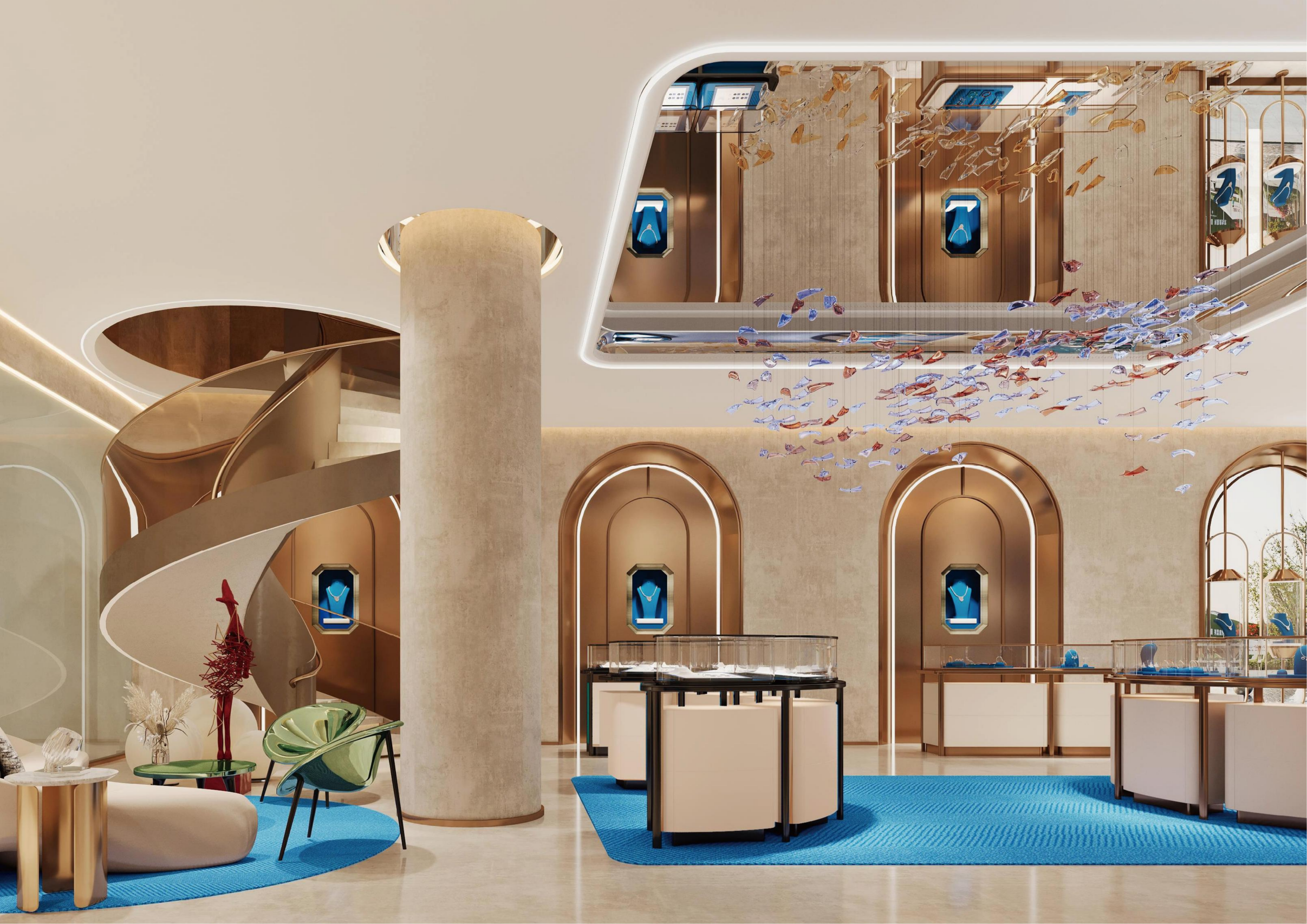 Moving beyond traditional opulence, the "JOY AND JEWELRY" flagship is conceived as an artistic modern luxury space. The core design logic—"brand symbolism + experiential luxury"—directly addresses the dual nature of high-end jewelry: its emotional resonance and quality premium. By integrating a high-impact brand color, fluid spatial forms, and strategic art installations, the design breaks the mold of stereotypical jewelry boutiques. The result is a new paradigm: a contemporary high-end consumption zone that equally prioritizes an artistic atmosphere and supreme comfort.